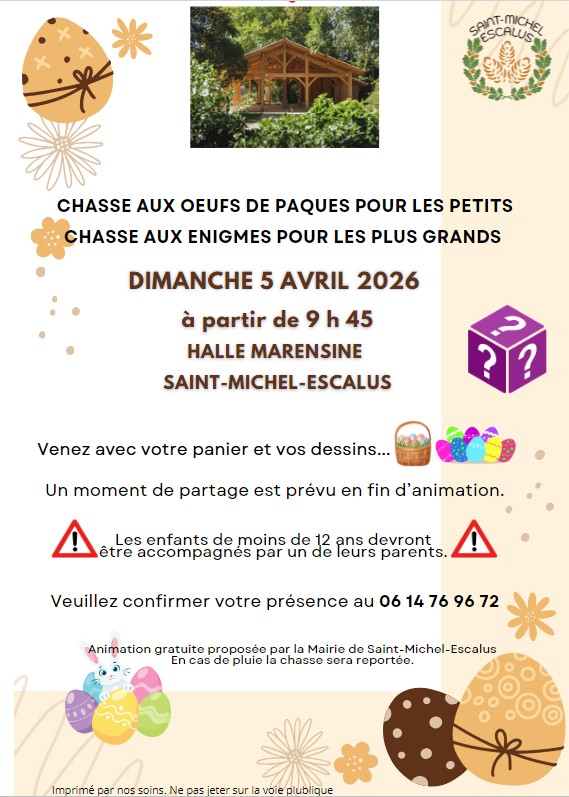 PAQUES DIMANCHE 5 AVRIL 2026 Publié le 27 mars 2026 / Dernière modification le 27 mars 2026 PAQUES DIMANCHE 5 AVRIL 2026 Publié le 27/03/2026 - Dernière modification le 27/03/2026 Le dimanche 05 avril 2026 de 09:45 à 12:30 Chasse aux œufs de pâques pour les petits, Chasse aux énigmes pour les plus grands Dimanche 5 avril à partir de 9h45Halle Marensine, Saint-Michel-Escalus
