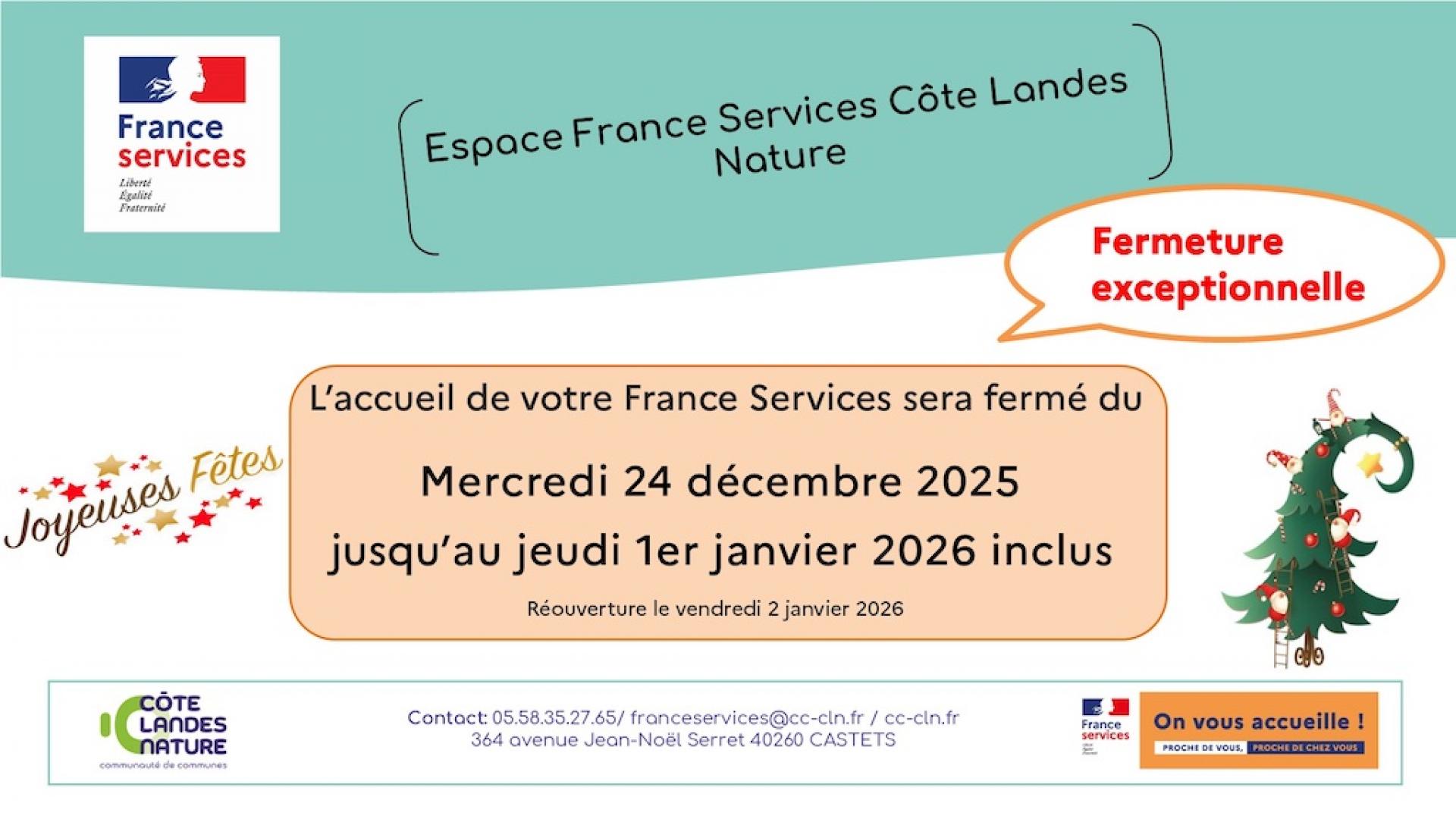 Fermeture exceptionnelle de l'Espace France Services Publié le 15 décembre 2025 / Dernière modification le 15 décembre 2025 Fermeture exceptionnelle de l'Espace France Services Publié le 15/12/2025 - Dernière modification le 15/12/2025 Du mercredi 24 décembre 2025 au jeudi 1er janvier 2026 inclus, l'EFS Côte Landes Nature sera fermé.