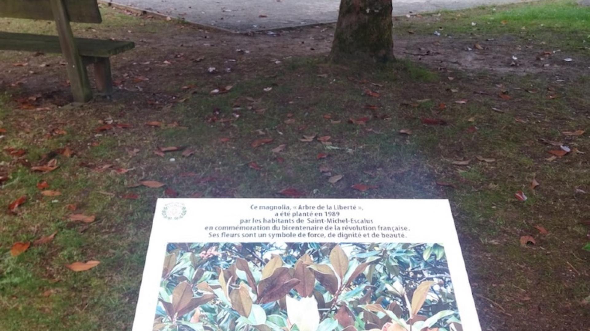 Magnolia 1989 Publié le 15 octobre 2025 / Dernière modification le 15 octobre 2025 Magnolia 1989 Publié le 15/10/2025 - Dernière modification le 15/10/2025 En commémoration du bicentenaire de la révolution française les habitants de Saint-Michel-Escalus ont planté ce magnolia " Arbre de la liberté ". Ses fleurs sont un symbole de force, de dignité et de beauté.